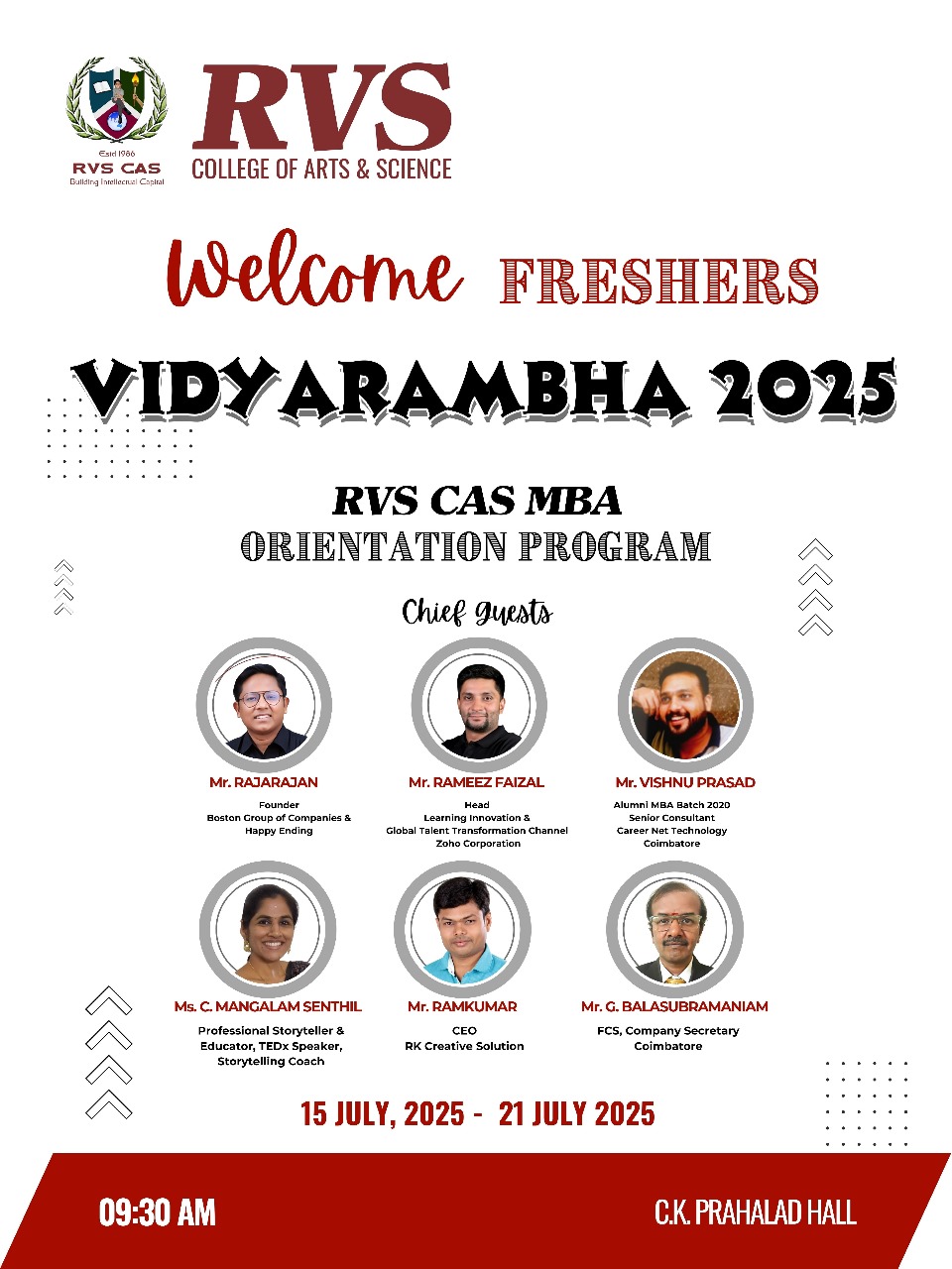 RVS College of Arts and Science is all set to welcome the incoming MBA batch with VIDYARAMBHA 2025 — an inspiring and engaging orientation program scheduled from 15th July to 21st July 2025.